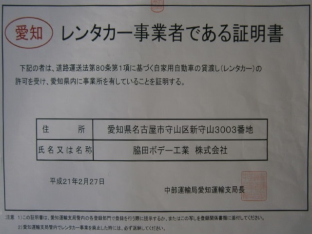レンタカー事業者である証明書